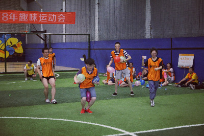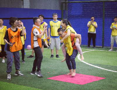 两手臂和腿各自夹球的队员,呈企鹅状向前行进,萌态十足。参赛队员气氛高涨、秩序井然,不时传来呐喊和喝彩声。