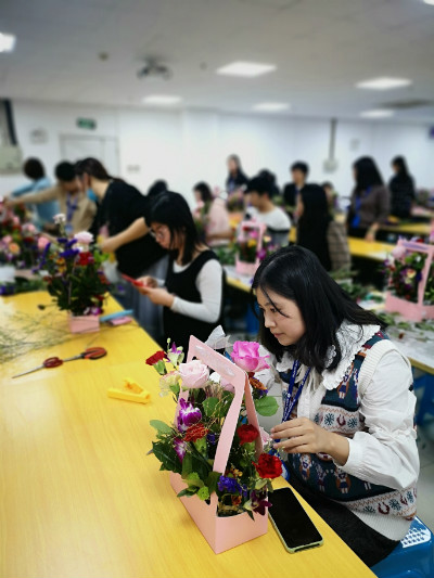 活动现场,花艺老师向大家详细讲解了花艺知识及插花技巧,并进行操作演示。 在花艺老师的指导下,大家开始认真修剪枝叶、设计造型,发挥自己的想象及创造力,通过悉心修剪和巧妙的组合,一盆盆典雅的花束悄然绽放。