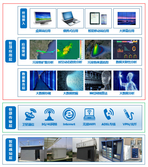 智慧服务层:以云计算、虚拟化和高性能计算等技术手段,整合和分析区域内的环境信息,实现数据存储、实时处理、深度挖掘和模型分析。建立面向对象的业务应用系统和信息服务门户,为环境质量、污染防治、生态保护等业务提供“更智慧的决策”.