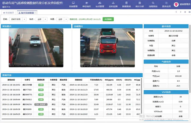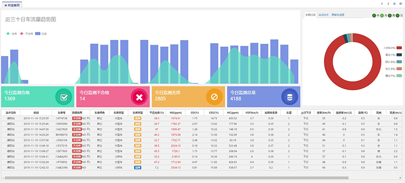 本平台集数据采集、统计分析、报告发布、地图于一体,实时监测各个监测点位上下行车道的车辆排污情况及各站点的环境空气质量信息。通过与其他交管信息库对接,可以实现车辆基本信息的查询,并由此对黄绿标车、车辆燃油等类型的数据进行统一的检测和分析,可应用于有车辆经过的各个车道、场所以及车流量集中地。