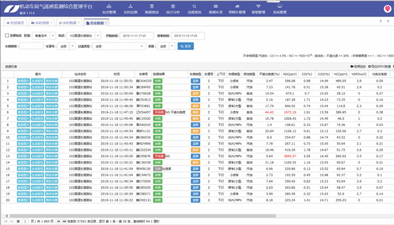 尾气遥感检测平台实现了对机动车尾气数据的采集、管理维护功能。可以实时查询固定式站点监测数据及移动式站点监测数据。所监测的数据信息涵盖了机动车尾气检测参数值、气象参数数据、环境空气质量数据、黑烟车数据等。同时结合环境空气质量数据与尾气检测数据进行统计分析,并与交管局、车管所进行数据库对接。形成了实时查询和匹配车辆基本信息于一体的数据检测、统计、分析系统。