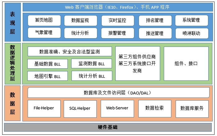 系统的主要功能模块包括:电子地图、实时监控、数据查询、报警管理、站点排名、统计分析、网络监控、喷淋联动、系统管理、运维管理。