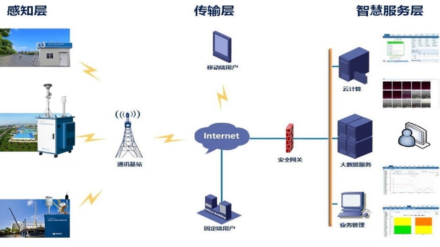 以自动化监测仪器为数据监测、存储、上传的载体,通过在环保主管部门建设数据中心、部署软件应用系统,利用已建或新建网络,各职责部门可通过手机、电脑终端等方式应用监测数据,从而实现对环境空气质量的采集、分析、应用和决策。