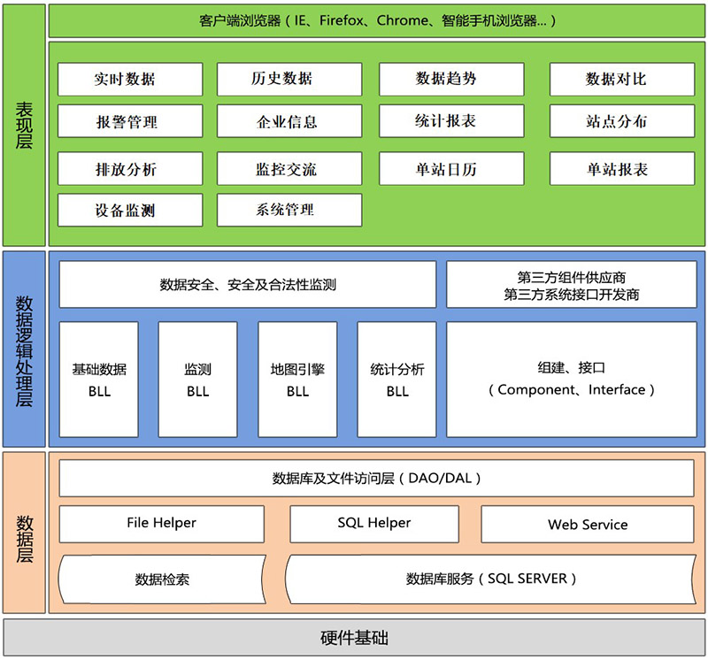 挥发性有机物在线监测平台采用B/S结构,实现基于GIS的面向重点污染源的在线监控系统,能够及时掌控重点污染源各种挥发性有机物污染物因子的排放情况。系统应用物联网技术,将监测设备采集到的实时数据,通过联网上报的方式上传到监测系统数据库中,利用互联网信息化技术展现到环境在线系统页面上。