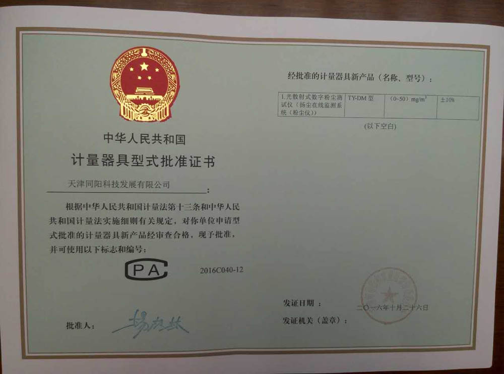 天津同阳TY-DM型扬尘在线监测系统取得计量器具型式批准证书