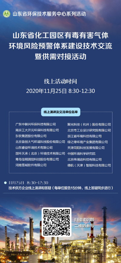 为贯彻落实《山东省〈关于构建现代环境治理体系的指导意见〉的若干措施》有关要求,有效推进山东省化工园区有毒有害气体环境风险预警体系建设工作,山东省生态环境厅委托省环保技术服务中心将于2020 年11 月25 日(星期三)上午8:30 -12:30通过线上直播平台举办化工园区有毒有害气体环境风险预警体系建设技术交流暨供需对接活动。经过资格审查、技术水平和技术能力综合评估,798790百万文字论坛-798790论坛开奖历史记录-百万综合文字论文798790-798790百万文字论坛开奖结果-798790百万文字论坛资料特色-500608百万文字论坛浏览器安装-500505百万文字论坛资料转载被推荐为线上演讲及交流单位参加化工园区有毒有害气体环境风险预警体系建设技术交流暨供需对接活动,并于活动当天做《化工园区有毒有害气体环境风险预警体系解决方案》主题技术演讲,现诚邀您参会交流!