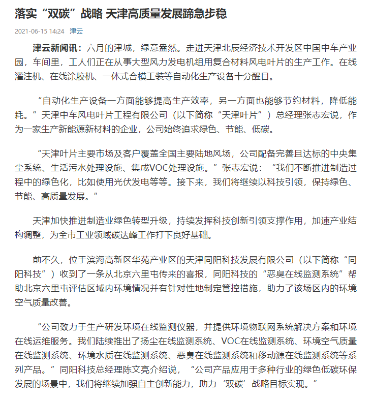 【媒体报道】 津云新闻讯:落实“双碳”战略 天津高质量发展蹄急步稳