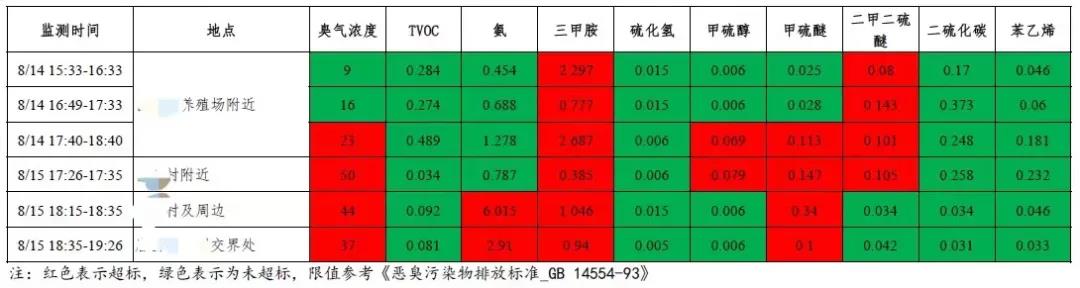 某市农业源恶臭来源主要包括养殖场、屠宰场、贮粪场等,粪便、动物屠宰后的内脏露天堆放以及水体富营养化致使其周边恶臭污染十分严重。本次恶臭走航主要针对某市西北方向的某三个村落进行监测,监测结果显示A村附近畜禽养殖场恶臭污染严重,两次(14 日、15日)走航均监测出臭气浓度、三甲胺、二甲二硫醚超标情况,尤其是三甲胺,峰值浓度超标32.6倍,且三甲胺具有烂鱼臭,极大影响周边居民生活质量。此外,在B村附近监测出臭气浓度、氨、三甲胺、甲硫醚超标,其为畜禽粪便堆肥场的典型恶臭因子,经现场巡查发现超标点位周边确实存在大型养殖场及大面积露天贮粪场。