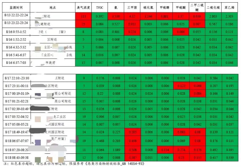 针对某市重点涉气企业进行恶臭走航监测,结果显示某固废附近、某垃圾厂对面、某工业区及某企业厂界附近均出现恶臭超标现象。尤其是某固废附近,在一处垃圾处理车间附近有刺鼻恶臭,监测数据显示臭气浓度、氨、三甲胺、硫化氢、甲硫醇、甲硫醚、二甲二硫醚均处于高浓度,分别超标 4.7 倍、1.4 倍、53.0倍、19.8 倍、124.9倍、18.6 倍、14.6 倍,恶臭污染严重。监测期间,甲硫醇、甲硫醚、二甲二硫醚浓度均明显上升,且均超标。