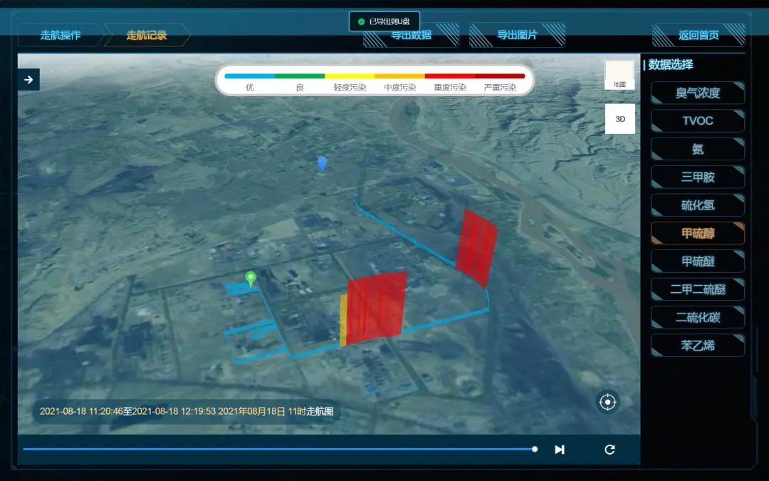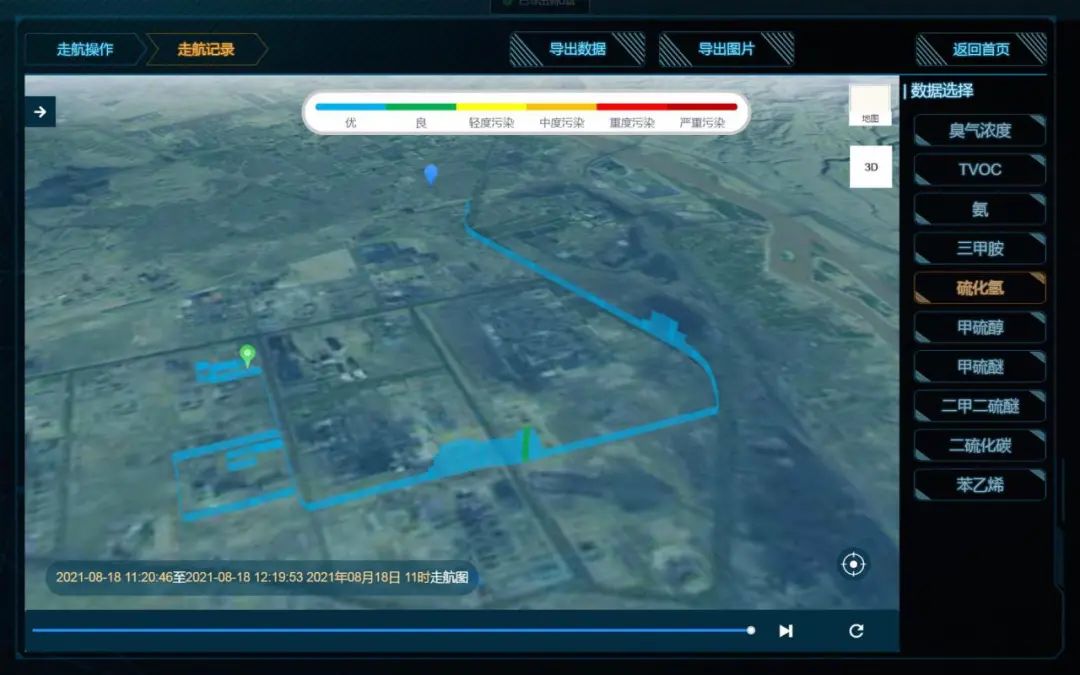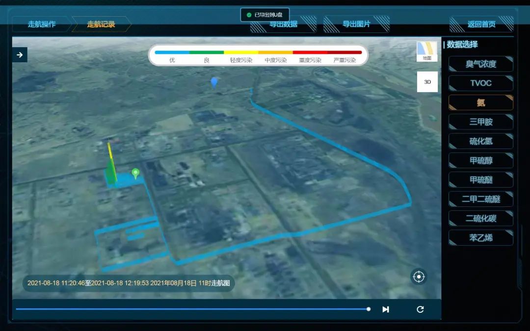 本次走航监测出多个超标点位,共发现7 处甲硫醚超标区域、5 处二甲二硫醚超标区域、2 处甲硫醇超标区域、2 处硫化氢超标区域、1 处臭气浓度超标区域和2 处臭气浓度高值区域,另有1 处氨气高值区域。便携式恶臭监测仪能够快速定位异味浓度高值区域,通过监测数据,判断出个别点位有较为严重的恶臭污染发生。通过本次走航监测,该工业园区及时做出应对,避免了污染的大范围扩散。本次走航监测为该工业园区的后续治理工作提供了科学的数据支撑,得到了客户充分的认可。