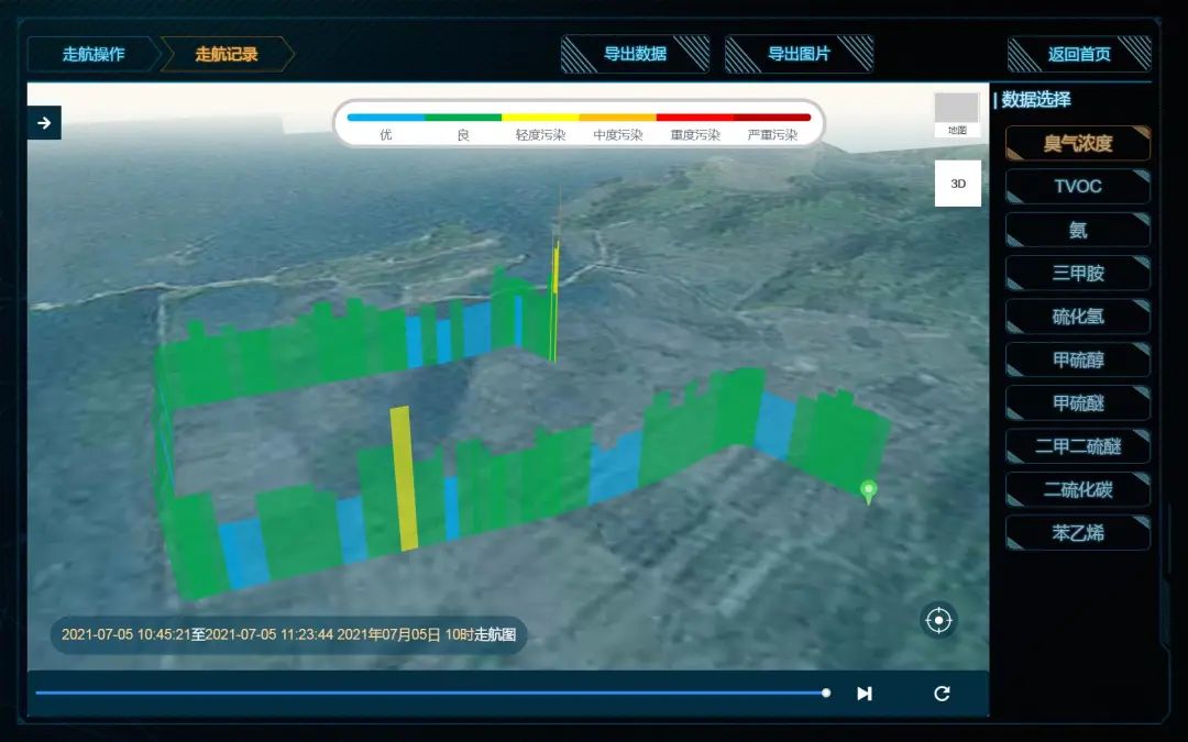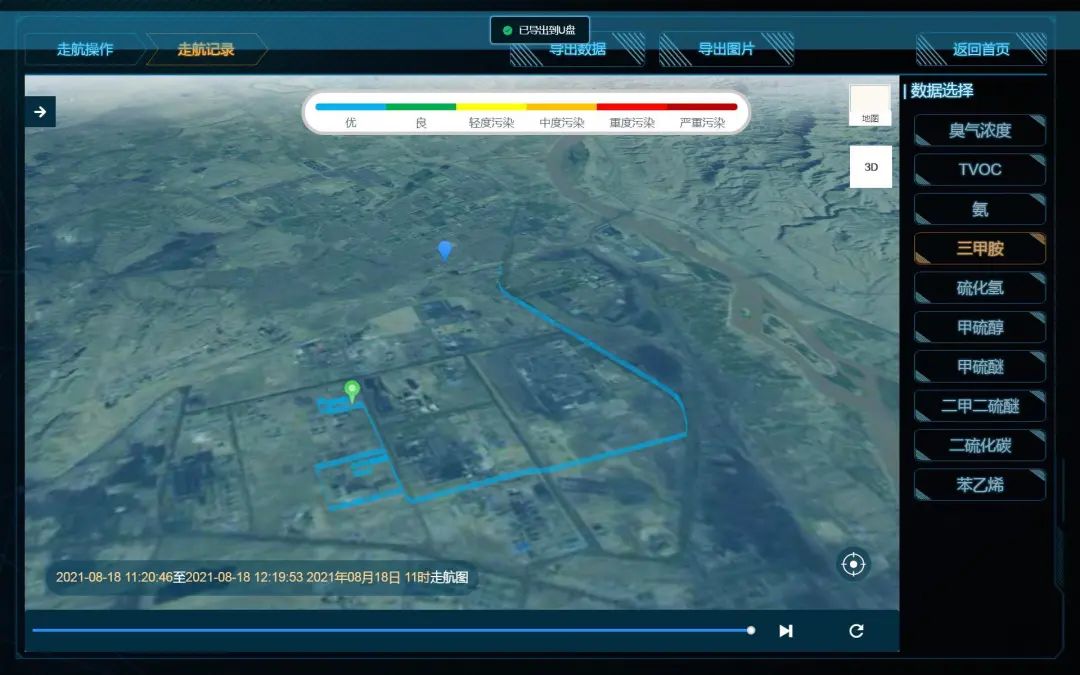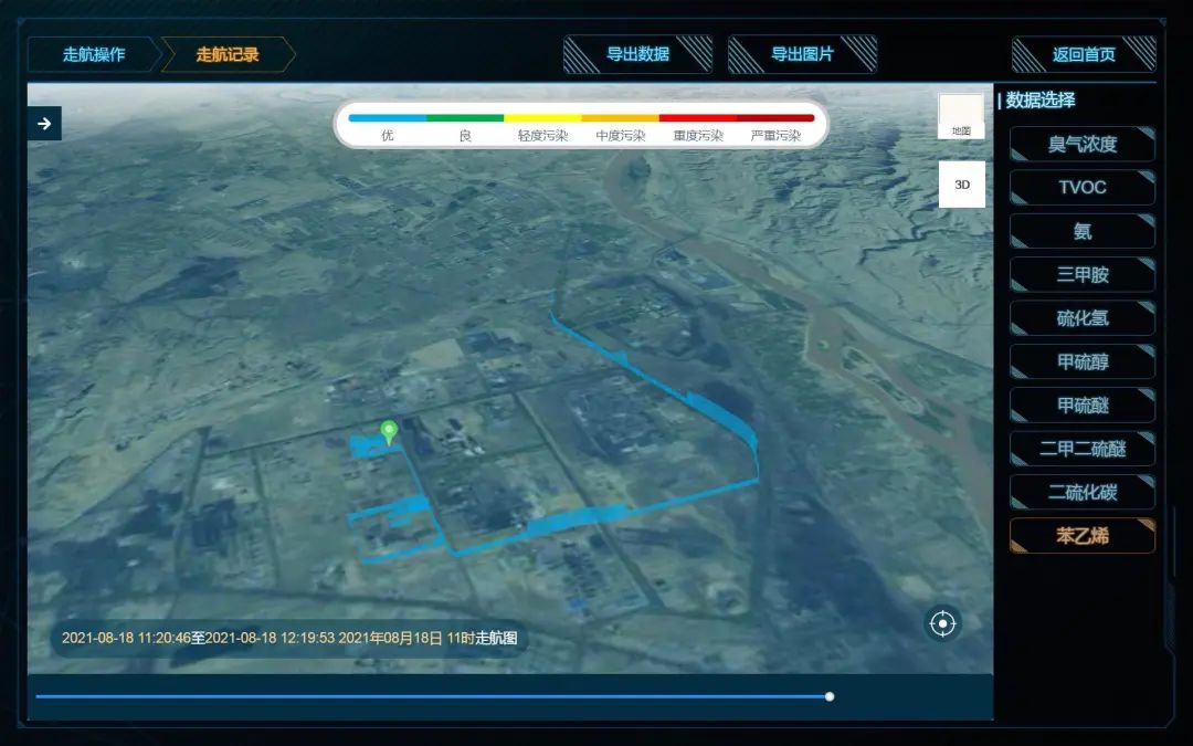 此次走航期间,仅发现2处臭气浓度监测数值相对较高的区域。第一个高值区域为某新材料公司二期厂区,走航车经过该区域时,走航地图显示臭气浓度以黄色柱形图显示,属轻度污染,结合导出的走航数据发现,该区域的臭气浓度监测因子最高值达到13(OU),虽未超标,但略高于其他区域监测数值;第二个高值区域为某气体生产单位厂区附近,现场人员经过该区域时能够闻到空气中的臭味,因此在该区域进行了短暂的停留,后结合导出的走航地图及走航数据发现,该区域的臭气浓度监测因子数值最高达到19(OU),也未超过国家二级标准规定的20(OU)浓度要求。综合分析,本次走航监测区域整体空气质量较为优良,无长时间、气味明显的恶臭污染,但应该针对某新材料公司和某气体生产企业进行重点监控。本次走航监测,为当地环境部门进行重点区域恶臭污染排查提供了可靠的数据支撑,对于敦促企业进行整改、确保该市环境空气质量维持优良水平贡献出了一份力量。