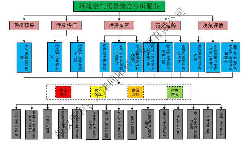 总体架构分为业务层、工具层和数据层。业务层指通过综合基础数据、工具和专业知识而形成的,为用户解决特定需求的一系列事务、活动和方法集合,公司将各种基于科学研究的分析以标准化的方案和流程,形成业务化的服务项目,包括预警预报、污染特征、污染成因、污染追踪和决策评估5类数据分析服务业务。工具层是指在数据分析业务过程中需要利用的技术和服务工具与模式,主要包括数值模式、受体模型、人工数据分析和巡查服务。基础数据指整个分析服务过程中使用的所有数据,包括空气质量观测数据、气象观测数据、颗粒物成分谱数据、挥发性有机物组分数据等十三大类。