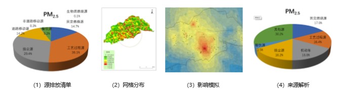 基于颗粒物浓度及化学组分监测数据,利用化学质量平衡模型(CMB)、正交矩阵因子分析模型(PMF)等受体模型 进行拟合运算,定量解析各主要排放源类对PM2.5、PM10 的贡献值和分担率,确定针对颗粒物污染防治的重点管控源类。基于动态更新的大气污染源排放清单,结合近地面污染物监测数据和气象数据,针对PM2.5等大气污染防治的重要指标,通过中小尺度数值模式模拟及可视化面分析,提供基于辖区、街镇级别区域、细分源类的来源分析以及与预